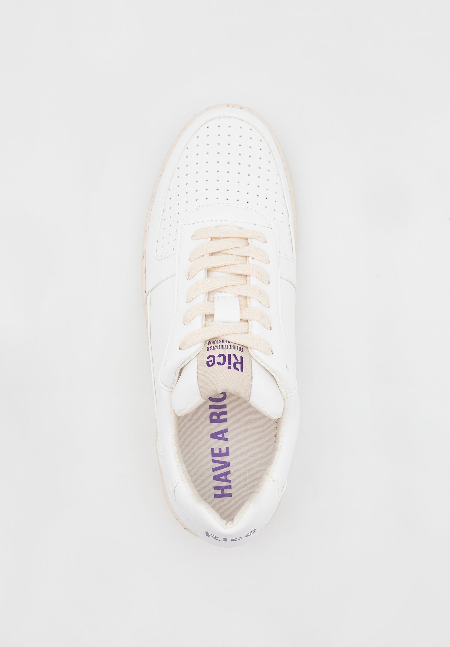 Weißer Sneaker „Rice OPEN21“ – eine zeitlose Silhouette mit strukturellen Details, die moderne und Vintage-Designelemente vereint. Hergestellt aus absolut hochwertigen Naturmaterialien (wie Reiskörnern und Spreu, Apfelstiel, veganem Maisleder und Bio-Baumwolle).